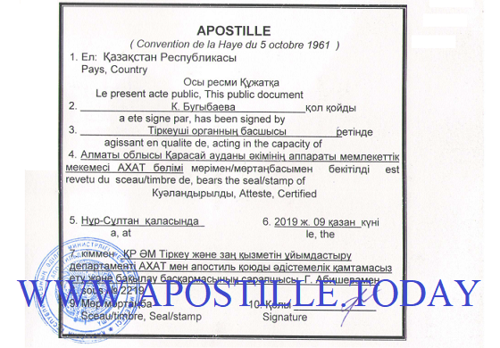 A sample of the apostille of the General Prosecutor`s Office of Kazakhstan.
