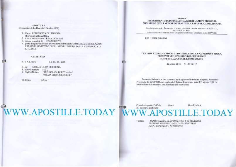 A sample shows the procedure of legalization of a police clearance certificate in Lithuania in order to acquire citizenship of Italy.