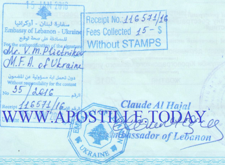 A sample of the final stage of legalization in the consular division of the Embassy of Lebanon in Kyiv.