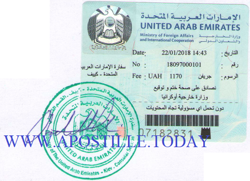 A sample of the final stage of legalization in the consular division of the United Arab Emirates in Kyiv.