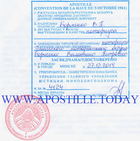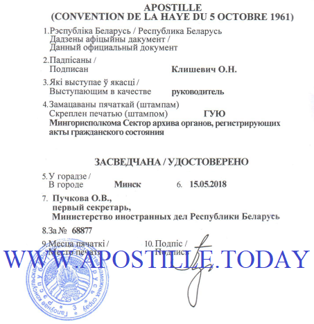 - Департамент по архивам и делопроизводству Министерства юстиции РБ. Данное государственное ведомство заверяет апостилем различные архивные документы.