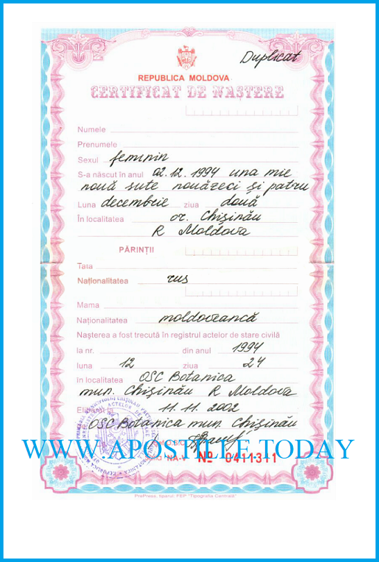 Номер и секретный код для проверки подлинности апостиля на сайте Министерства юстиции Молдовы, а также некоторые данные на свидетельстве были удалены, с целью сохранения в тайне персональных данных клиента.