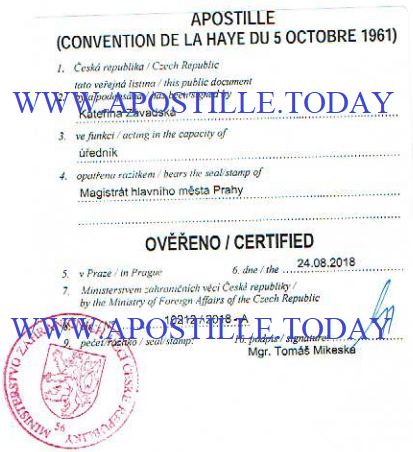 Before apostilization, a certificate should be certified in the magistrate. A magistrate in the Czech Republic is something like a city hall in Ukraine, Russia or Belarus. As a matter of fact, the certification in the magistrate confirms the authenticity of the official`s signature and the seal placed on a certificate. Once the magistrate certified an original, it is submitted to the Ministry of Foreign Affairs in Prague to be apostilled. The Ministry verifies the authenticity of the official`s signature, the magistrate`s seal and decides whether to place an apostille on a document.