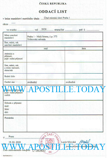 Пример свидетельства о браке в Чехии:
